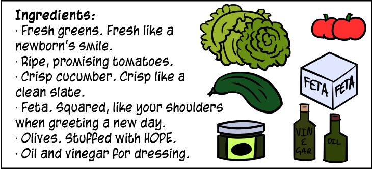 Forgiveness SaladForgiveness Salad contains Soul Fibre (TM) to help ease your bloated psyche.Share this: Click to share on Facebook (Opens in new window) Facebook Click to share on LinkedIn (Opens in new window) LinkedIn Click to share on Reddit (Opens in new window) Reddit Click to share on X (Opens in new window) X Click to share on Tumblr (Opens in new window) Tumblr Click to share on Telegram (Opens in new window) Telegram Click to share on WhatsApp (Opens in new window) WhatsApp Related