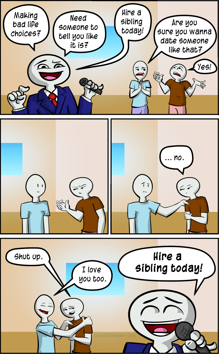 Hire A SiblingSiblings by chance, friends because what choice do you have really?Share this: Click to share on Facebook (Opens in new window) Facebook Click to share on LinkedIn (Opens in new window) LinkedIn Click to share on Reddit (Opens in new window) Reddit Click to share on X (Opens in new window) X Click to share on Tumblr (Opens in new window) Tumblr Click to share on Telegram (Opens in new window) Telegram Click to share on WhatsApp (Opens in new window) WhatsApp Related