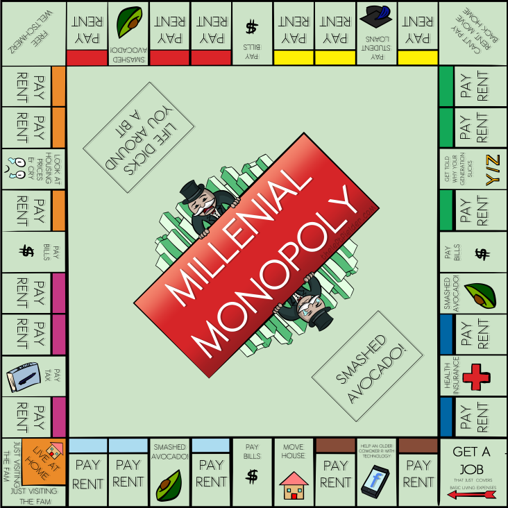 Millenial MonopolyPrintable versions of the Millenial Monopoly board are here – A2, A3, A4I haven’t written any cards though, so suggestions are welcome!Share this: Click to share on Facebook (Opens in new window) Facebook Click to share on LinkedIn (Opens in new window) LinkedIn Click to share on Reddit (Opens in new window) Reddit Click to share on X (Opens in new window) X Click to share on Tumblr (Opens in new window) Tumblr Click to share on Telegram (Opens in new window) Telegram Click to share on WhatsApp (Opens in new window) WhatsApp Related