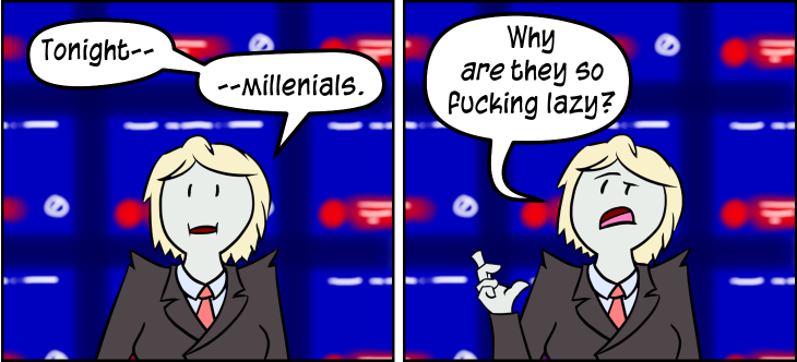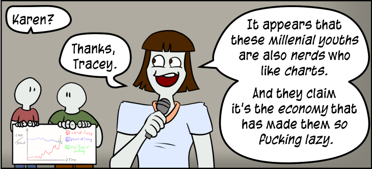 Millennials and the Cost of Living. Man, these gags just write themselves! Except when they don’t because I couldn’t pay the power bill and thus couldn’t write comics on the internet FUN TIMES.