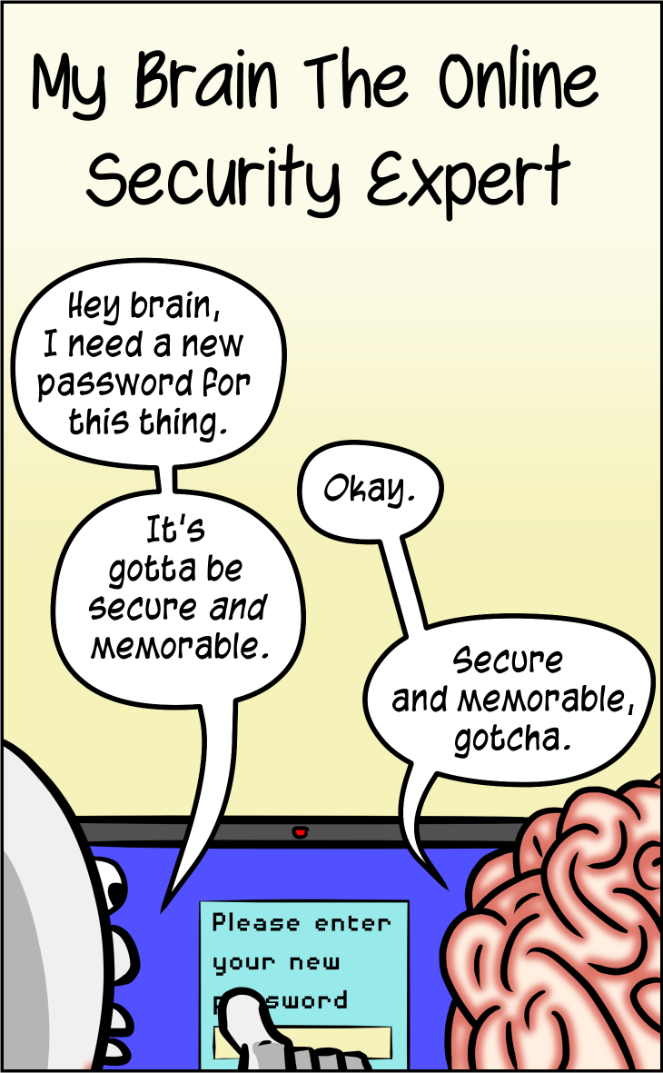 My Brain The Online Security ExpertOnline security is no small thing. Luckily, my brain is the expert at setting passwords.Share this: Click to share on Facebook (Opens in new window) Facebook Click to share on LinkedIn (Opens in new window) LinkedIn Click to share on Reddit (Opens in new window) Reddit Click to share on X (Opens in new window) X Click to share on Tumblr (Opens in new window) Tumblr Click to share on Telegram (Opens in new window) Telegram Click to share on WhatsApp (Opens in new window) WhatsApp Related
