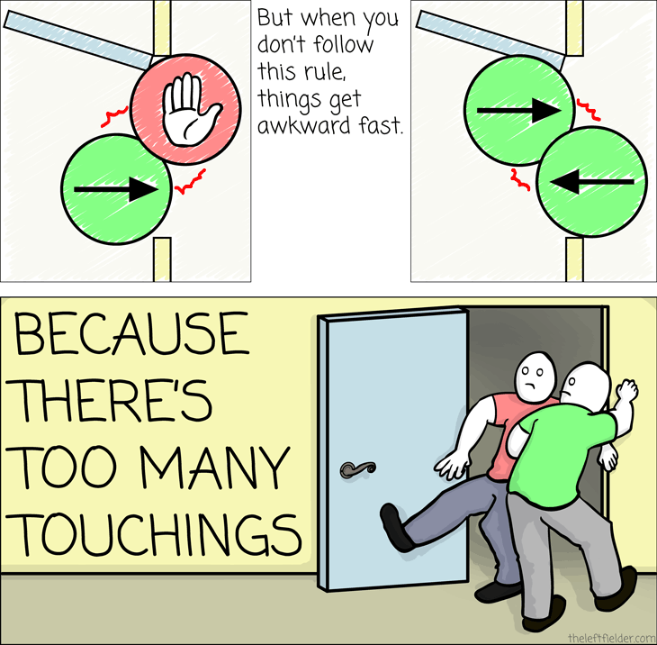 Your Dead Simple Guide to Modern Doorway Etiquette Who would think modern doorway etiquette could be this easy? Share this: Click to share on Facebook (Opens in new window) Facebook Click to share on LinkedIn (Opens in new window) LinkedIn Click to share on Reddit (Opens in new window) Reddit Click to share on X (Opens in new window) X Click to share on Tumblr (Opens in new window) Tumblr Click to share on Telegram (Opens in new window) Telegram Click to share on WhatsApp (Opens in new window) WhatsApp Related